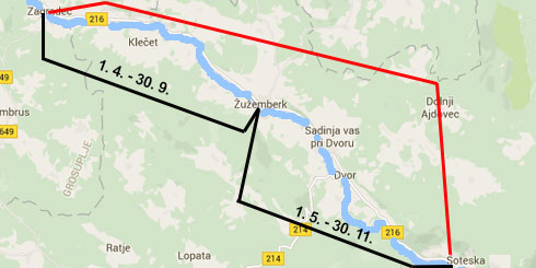 Od HE Zagradec do jezu v Žužemberku od 1. 4. do 30. 9. Od jezu v Žužemberku do jezu v Soteski od 1. 5. do 30. 11.
